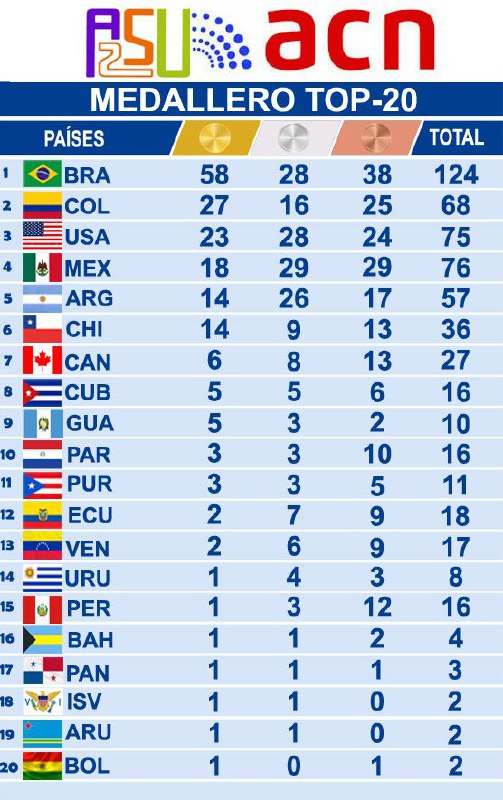 Brasil sigue en la punta de la tabla de medallas con una ventaja casi inalcanzable para sus escoltas, en tanto que acumula 124 preseas, incluidas 58 de oro, Colombia, en segundo puesto, suma 68 en total y 27 doradas, y va tercero Estados Unidos con 75 y 23.