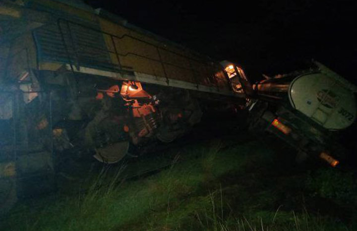 En los trabajos apoyan una grúa de 160 toneladas, además de dos locomotoras con su tren de auxilio dispuestas para esas maniobras, a fin de encarrilar la máquina que quedó semi volcada al chocar con el citado transporte de combustible, luego de que el chofer de este último violara la señal de pare en el crucero existente en el punto donde ocurrió el suceso.