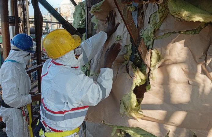 Las acciones más complejas se desarrollan en la torre de destilación atmosférica T-101, estructura fundamental donde se fracciona el crudo para obtener los derivados principales, Eralides Bueno Calas, director de Mantenimiento, señaló que la torre perdió completamente su aislamiento térmico, lo que exigió desmontarlo y reponerlo en su totalidad.