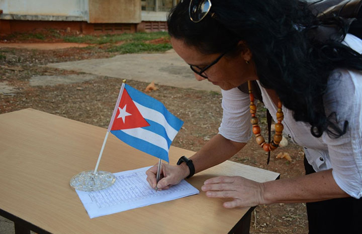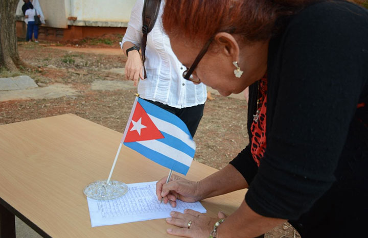 Durante el acto, la doctora Dayli Remón del Risco dió lectura a la declaración de la Federación de Mujeres Cubanas (FMC), la cual de acuerdo a sus palabras, resalta que las mujeres cubanas plasman su firma por la paz, y lo hacen desde la historia que han sostenido con sus manos.