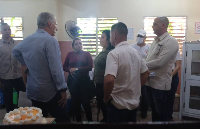En diálogo con Lázaro Morilla Quintana, titular jefe de la Cooperada, Díaz-Canel conoció sobre el equipamiento, los modos de cocción, las materias primas empleadas, la comercialización de alimentos y la atención al personal.