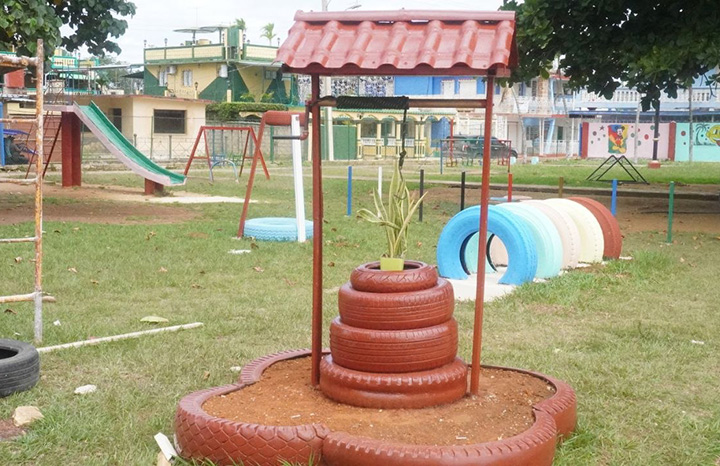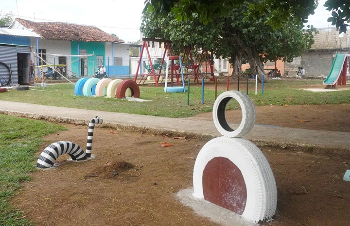 Añaden áreas de divertimento conformadas con neumáticos reciclados y lámparas solares para la iluminación de seguridad, además de mejorar la jardinería.