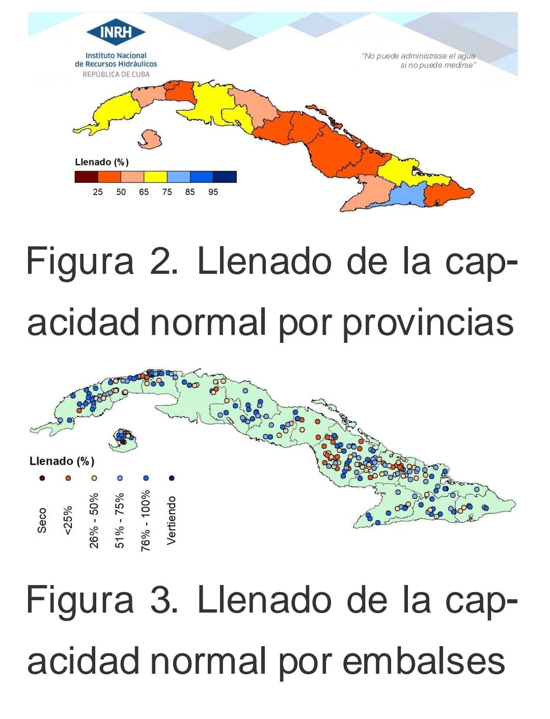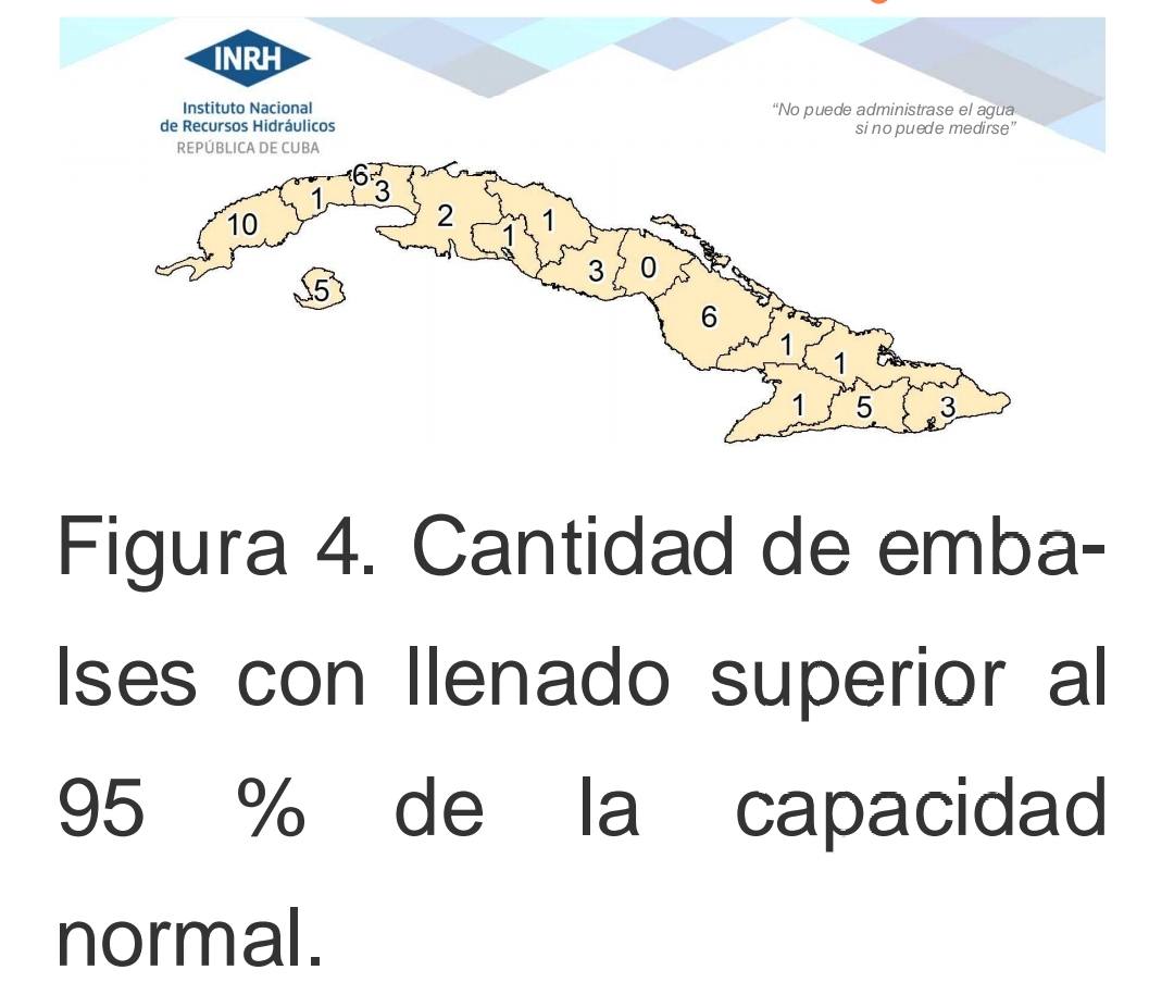El informe señaló que 49 embalses superaron el 95 por ciento de llenado, 38 alcanzaron el ciento por ciento de su capacidad y 28 vertían, principalmente en Pinar del Río, Santiago de Cuba, Mayabeque, Camagüey e Isla de la Juventud.