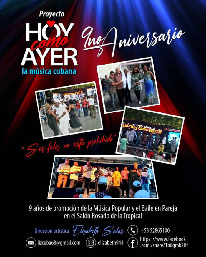 La Habana, 11 sep (ACN) El proyecto artístico "Hoy como Ayer, la música cubana", baluarte de la tradición sonera y de la música popular bailable en pareja, celebrará su noveno aniversario el próximo jueves 18 en su sede habitual: el Salón Rosado Benny Moré de la Tropical.
