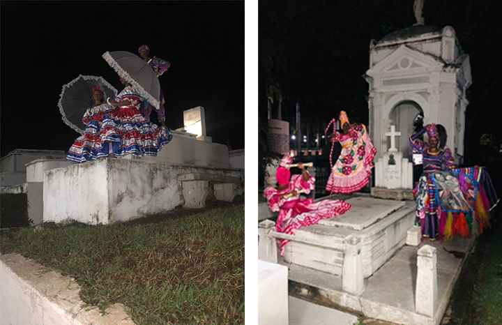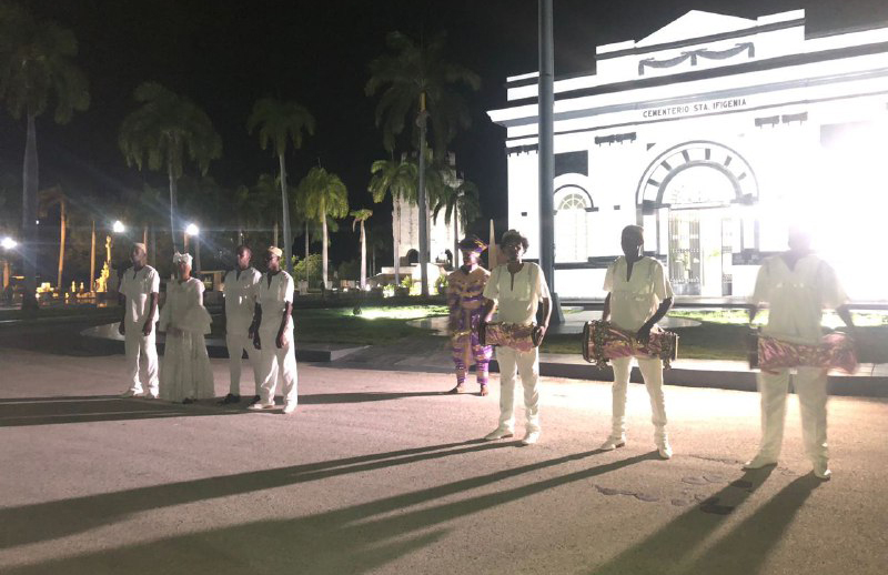El grupo folclórico Kokoyé, actores del Estudio Teatral Macubá, el declamador Elio Salas, el violín trovadoresco y varios artistas locales guiaron al público por esta travesía entre tumbas, leyendas, poemas y canciones que evocan la identidad de la urbe y de la nación caribeña.