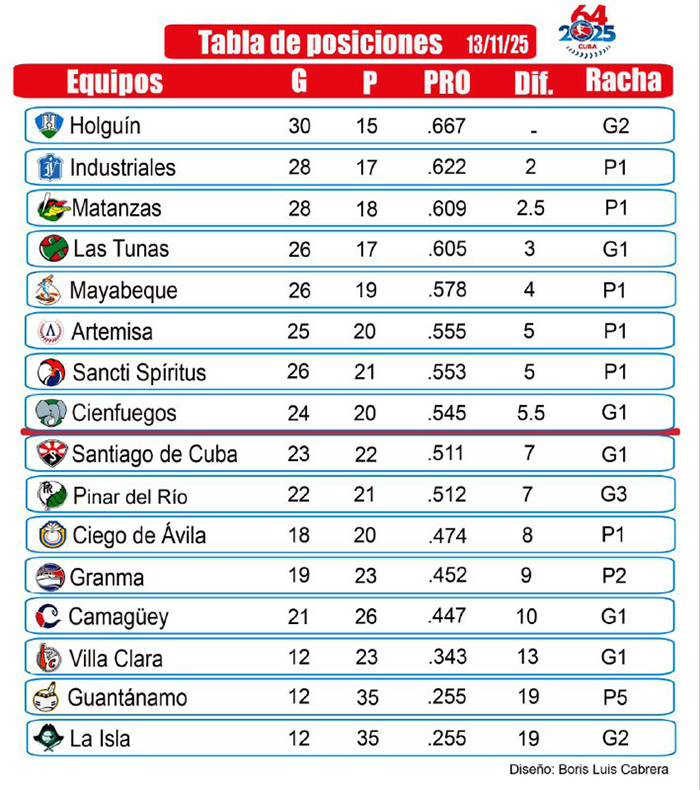 Por su parte, los Huracanes de Mayabeque, de visita en el estadio Tomás López, cayeron 4-8 ante los Leopardos de Villa Clara y vieron como se quebraba su racha ganadora de seis partidos.