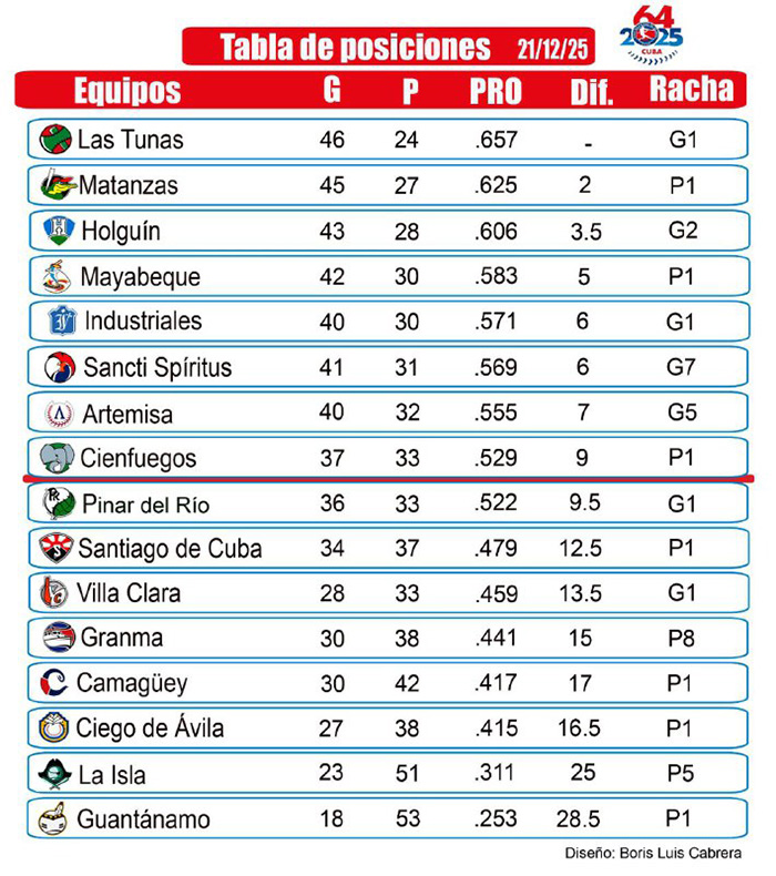 Por último, en el Nelson Fernández, los Cazadores de Artemisa también arribaron a 40 triunfos, al batir 4-3 a los Huracanes de Mayabeque, equipo que tendrá que esperar otra jornada para certificar su pase oficial a la gran fiesta del béisbol cubano.