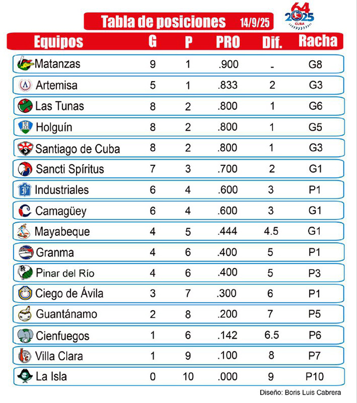 Aunque los dirigidos por Armando Ferrer extendieron su racha a ocho triunfos consecutivos, no dormirán tranquilos en el trono. Las selecciones de Santiago de Cuba, Las Tunas y Holguín ganaron sus respectivos choques y se mantienen a solo un juego de diferencia del lugar de honor.