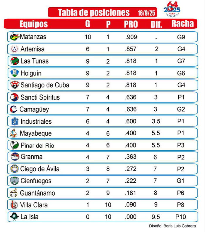 Por último, los Toros de Camagüey noquearon 12-0 a los Tigres de Ciego de Ávila, apoyados en una sólida apertura del zurdo Dariel Góngora, Eglis Eugellés bateó de 4-4 y se reafirmó como líder ofensivo del campeonato con un astronómico promedio de .765.