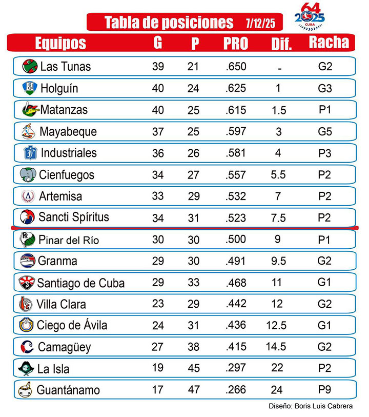 Mientras tanto, los vigentes campeones Leñadores de Las Tunas mantuvieron su puesto de honor al batir 7-4 a los Gallos de Sancti Spíritus en el estadio Julio Antonio Mella.