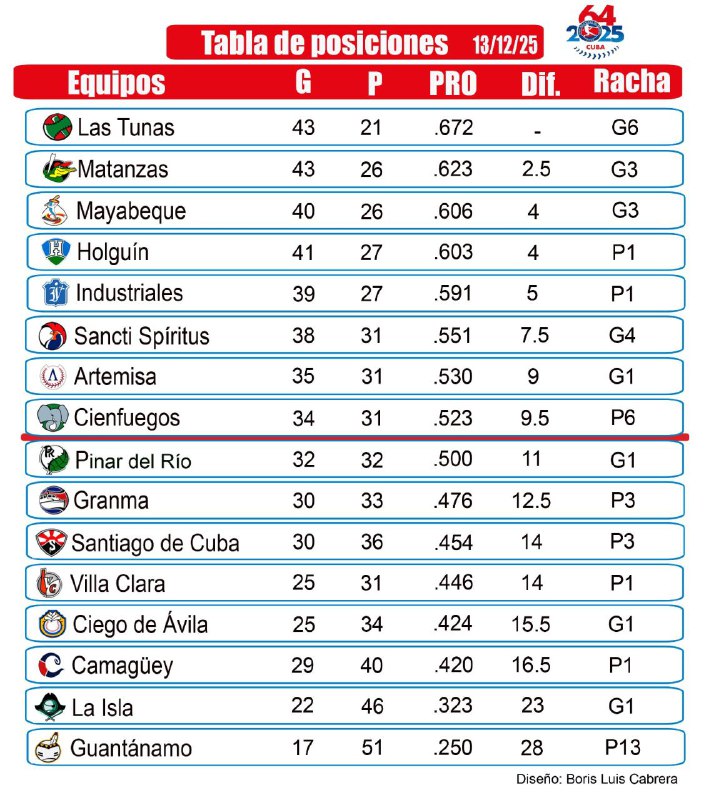 Por último, en el Capitán San Luis, los Vegueros de Pinar del Río vencieron 5-1 a los Toros de Camagüey y se acercaron a solo un juego y medio de la zona de privilegio.