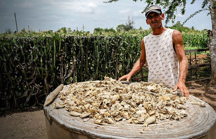 Ramón Hidalgo Batista, trabajador del PDL, puntualizó que la mezcla del pienso combina cosechas de la finca con residuos de pescado secados y molidos manualmente, una estrategia que optimiza la calidad y la aceptación de la comida entre las aves.