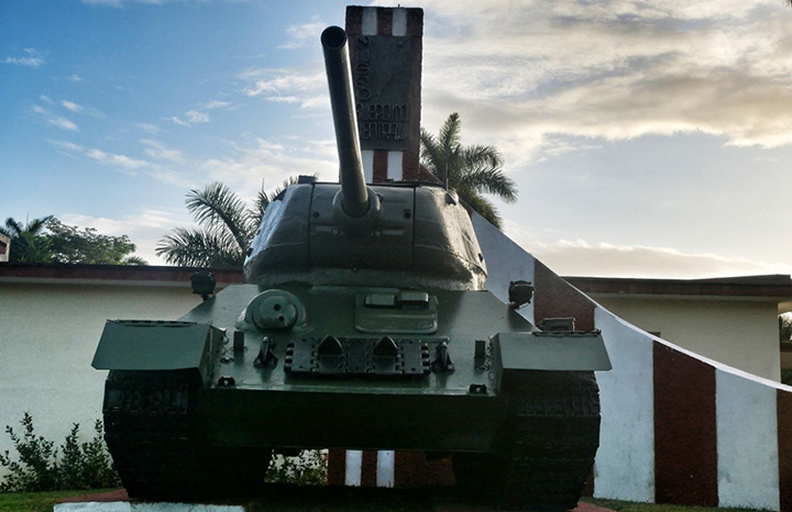 Uno de los tanques que adentraron esteras en las playas del occidental territorio corona la entrada del espacio, dirigido además a brindar a sus visitantes una oportunidad para conocer las páginas gloriosas del otrora Ejército del Centro.