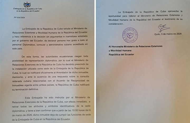 En consecuencia, a partir de las 10:00 a.m. (hora de Quito) de hoy 6 de marzo de 2026, el inmueble que hasta la fecha ha albergado la Embajada de Cuba en Ecuador cesa sus funciones como sede diplomática.