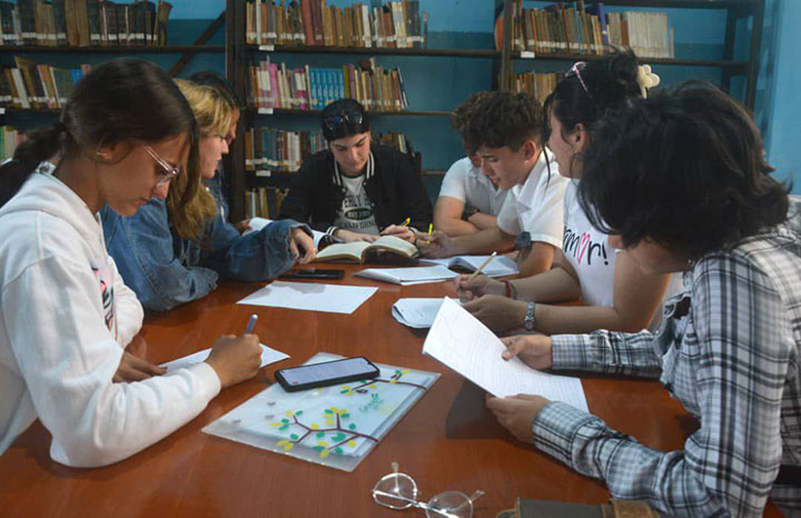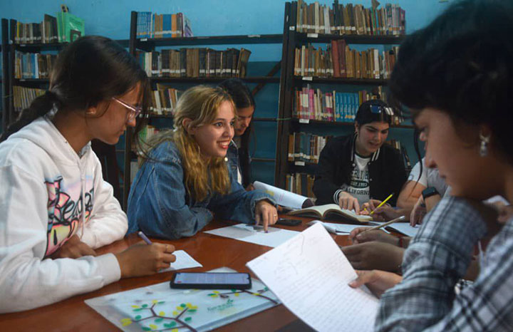 La alumna forma parte del grupo que, debido a la situación energética del país resultante del bloqueo económico de los Estados Unidos a Cuba, ha debido trasladar parte de sus actividades académicas a la biblioteca Martí, ubicada en el parque Vidal de Santa Clara, lo que evidencia la adaptabilidad y el compromiso de los muchachos con su formación.